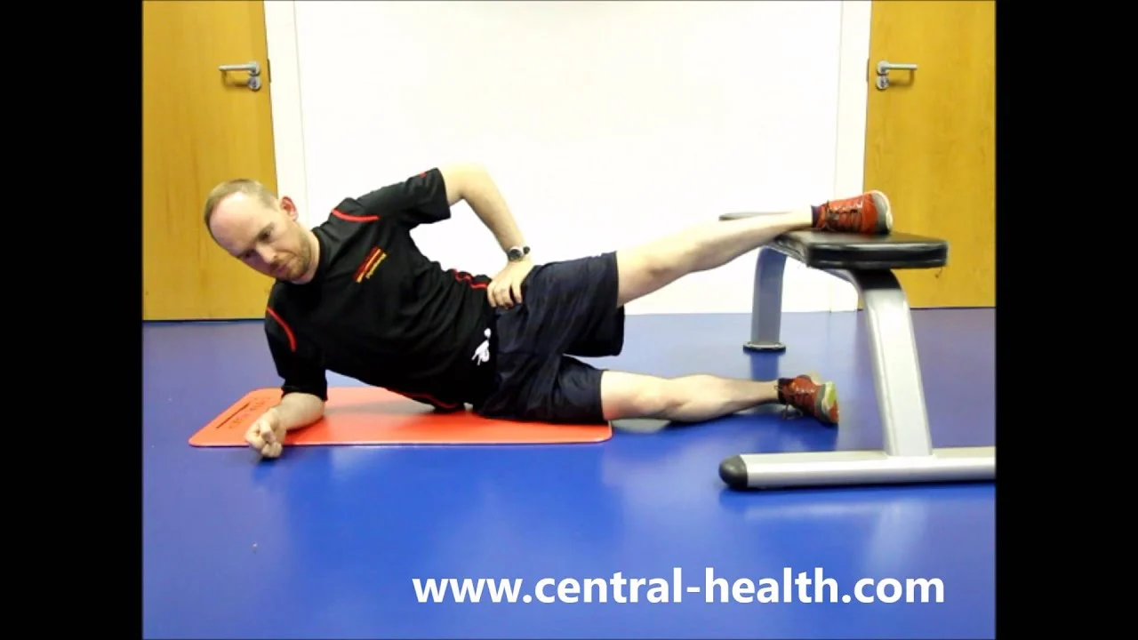 This exercise can be made more difficult by moving further away from the bench, so that less of your top leg makes contact with the bench.